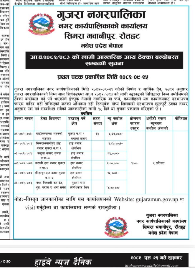 आन्तरिक आयको ठेक्का सम्बन्धी सूचना