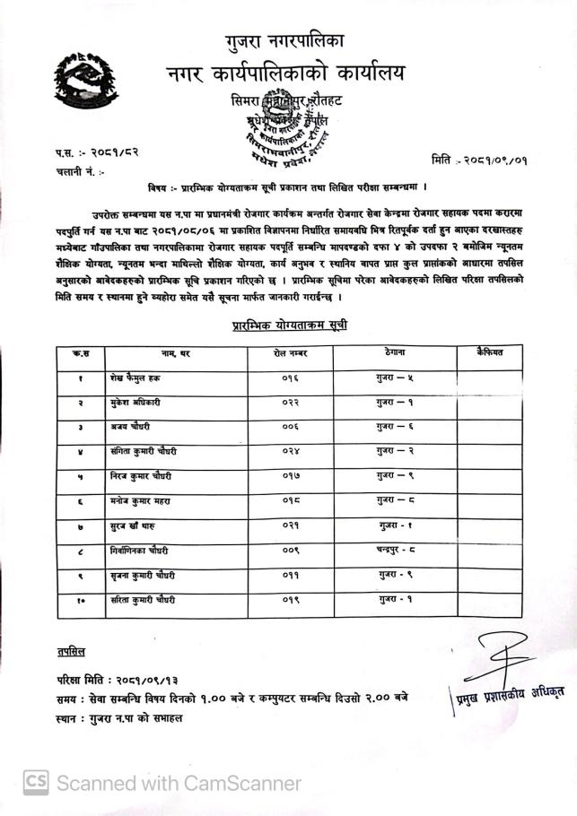रोजगार सहायक तथा प्राविधिक सहायक पदको प्रारम्भिक योग्यताक्रम सुची